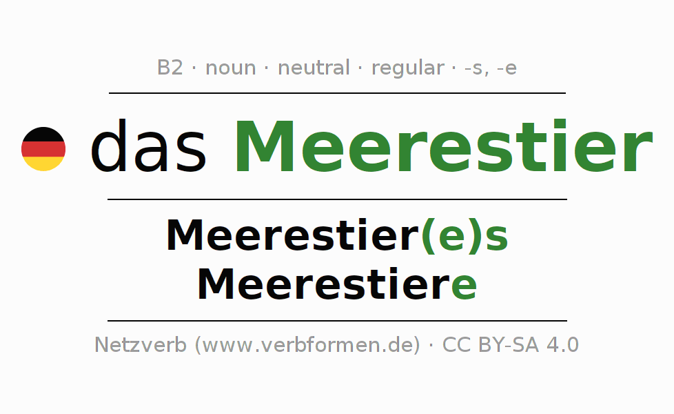 The declension of Meerestier as a table with all forms in singular (singular) and plural (plural) and in all four cases nominative (1st case), genitive (2nd case), dative (3rd case) and accusative (4th case). Especially for German learners the correct declension of the word Meerestier is crucial.