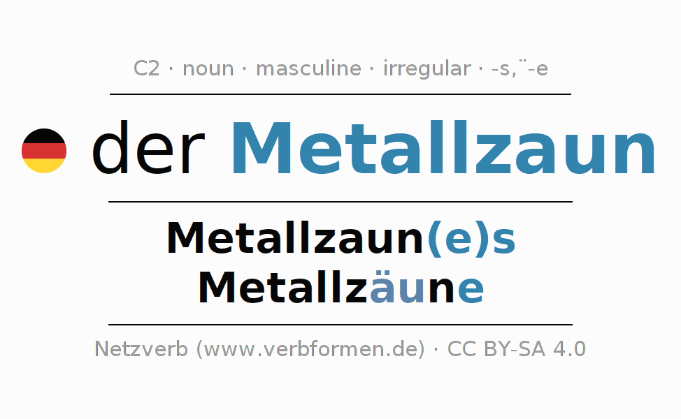 - Singular: der Metallzaun, des Metallzaun(e)s, dem Metallzaun(e), den Metallzaun