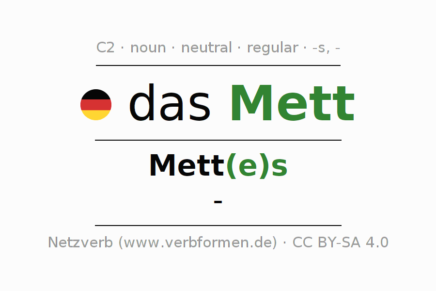 - Singular: das Mett, des Mett(e)s, dem Mett(e), das Mett