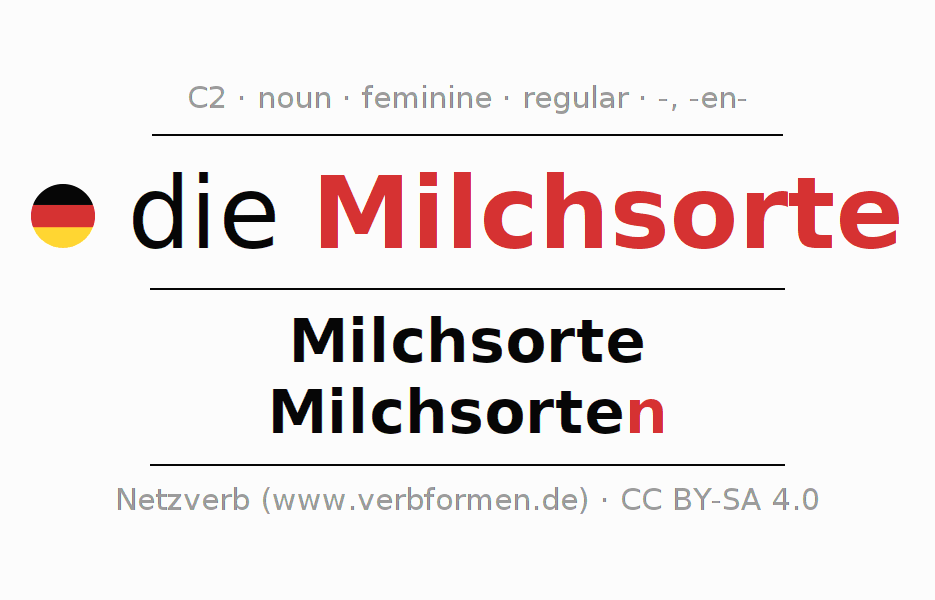 - Plural: die Milchsorten, der Milchsorten, den Milchsorten, die Milchsorten