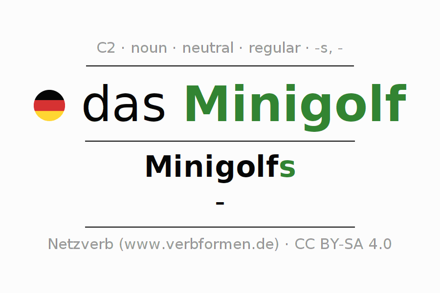 - Singular: das Minigolf, des Minigolfs, dem Minigolf, das Minigolf