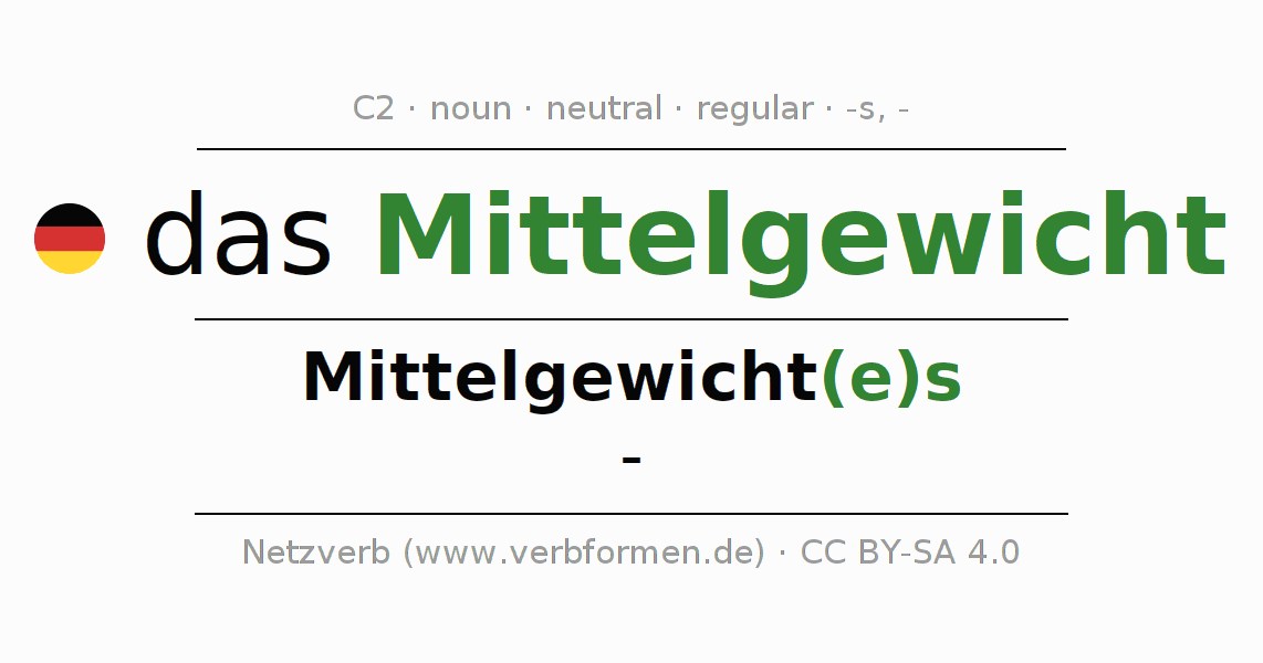 The declension of Mittelgewicht as a table with all forms in singular (singular) and plural (plural) and in all four cases nominative (1st case), genitive (2nd case), dative (3rd case) and accusative (4th case). Especially for German learners the correct declension of the word Mittelgewicht is crucial.