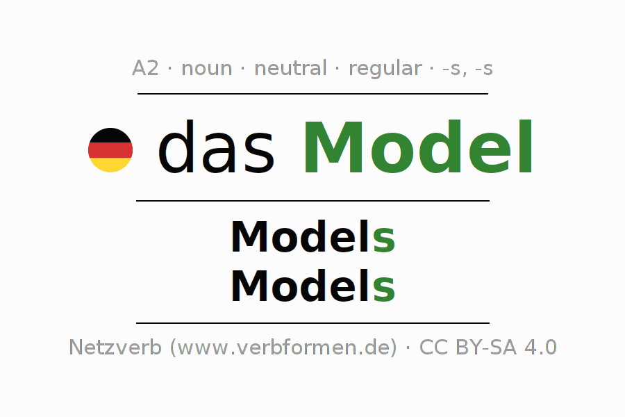 The declension of das Model as a table with all forms in singular (singular) and plural (plural) and in all four cases nominative (1st case), genitive (2nd case), dative (3rd case) and accusative (4th case). Especially for German learners the correct declension of the word das Model is crucial.