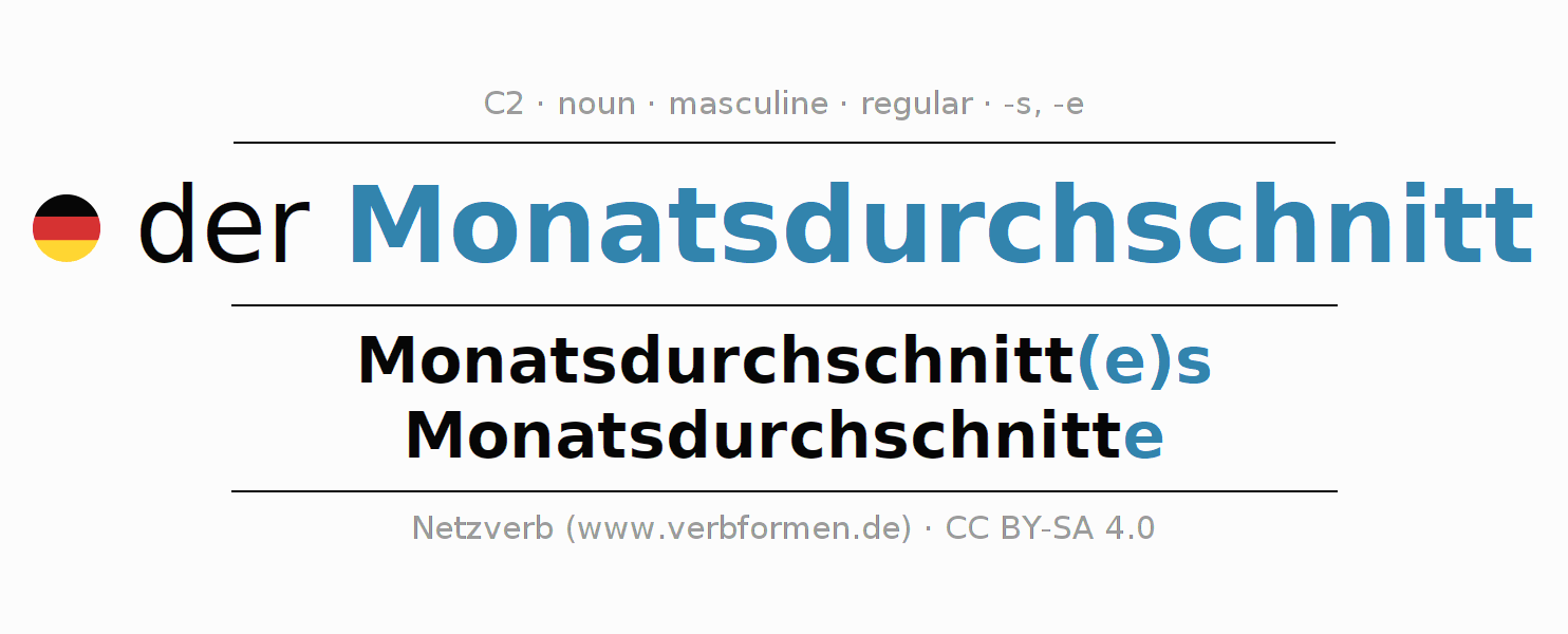 The declension of Monatsdurchschnitt as a table with all forms in singular (singular) and plural (plural) and in all four cases nominative (1st case), genitive (2nd case), dative (3rd case) and accusative (4th case). Especially for German learners the correct declension of the word Monatsdurchschnitt is crucial.