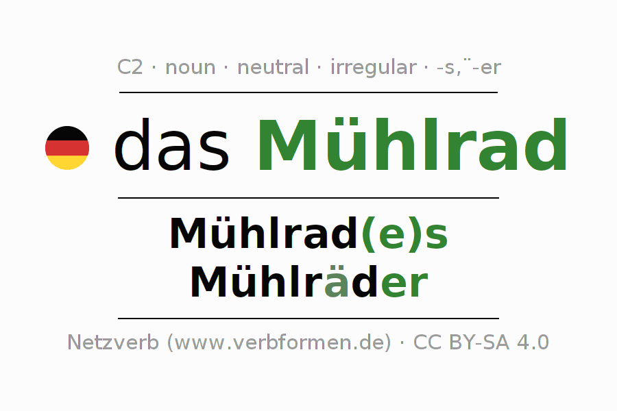 - Plural: die Mühlräder, der Mühlräder, den Mühlrädern, die Mühlräder