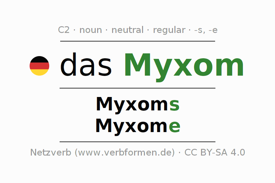The declension of Myxom as a table with all forms in singular (singular) and plural (plural) and in all four cases nominative (1st case), genitive (2nd case), dative (3rd case) and accusative (4th case). Especially for German learners the correct declension of the word Myxom is crucial.
