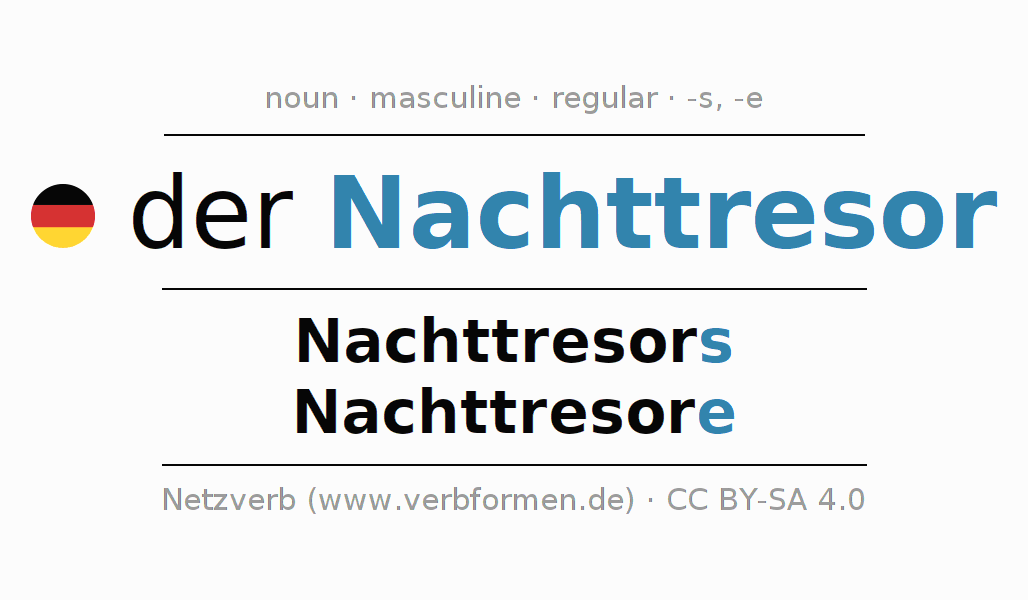 - Singular: der Nachttresor, des Nachttresors, dem Nachttresor, den Nachttresor