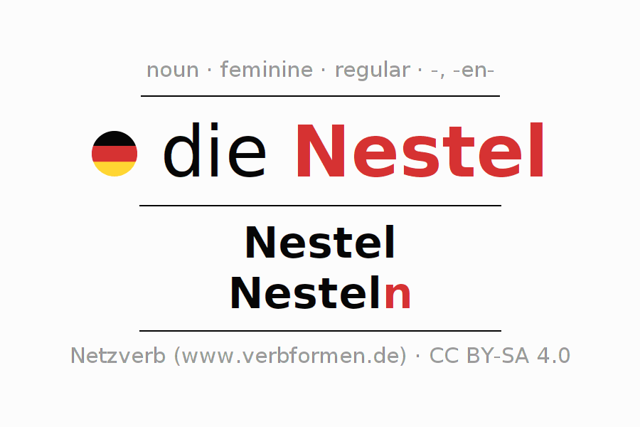 The declension of Nestel as a table with all forms in singular (singular) and plural (plural) and in all four cases nominative (1st case), genitive (2nd case), dative (3rd case) and accusative (4th case). Especially for German learners the correct declension of the word Nestel is crucial.