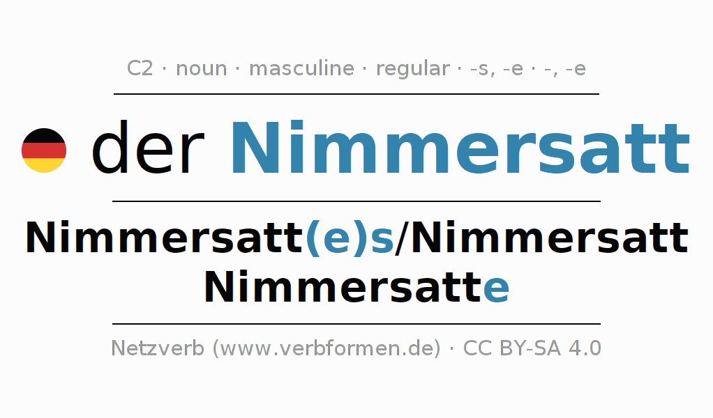 The declension of Nimmersatt as a table with all forms in singular (singular) and plural (plural) and in all four cases nominative (1st case), genitive (2nd case), dative (3rd case) and accusative (4th case). Especially for German learners the correct declension of the word Nimmersatt is crucial.