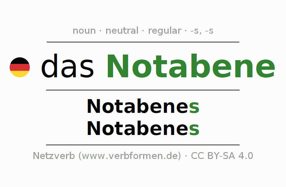 The declension of Notabene as a table with all forms in singular (singular) and plural (plural) and in all four cases nominative (1st case), genitive (2nd case), dative (3rd case) and accusative (4th case). Especially for German learners the correct declension of the word Notabene is crucial.