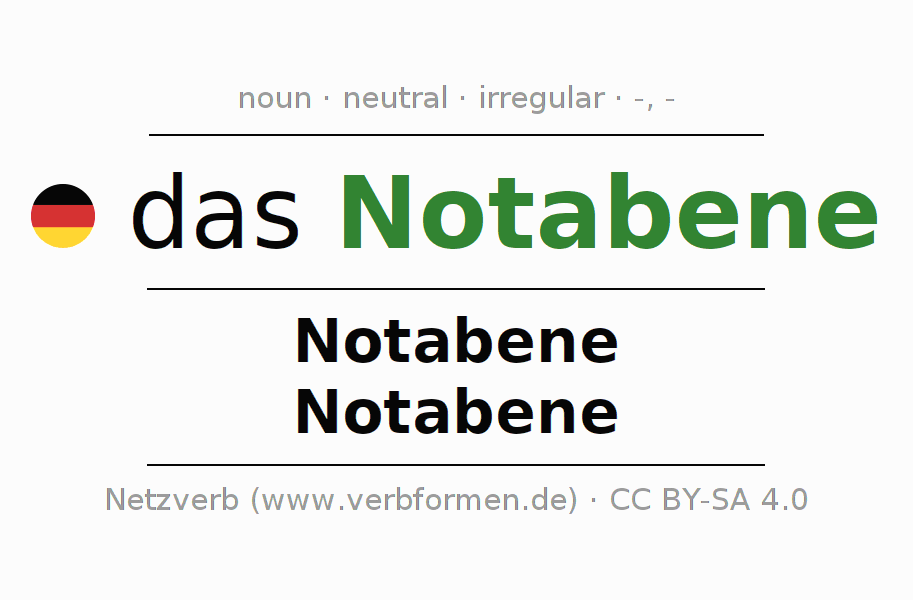 The declension of Notabene (Notabene) as a table with all forms in singular (singular) and plural (plural) and in all four cases nominative (1st case), genitive (2nd case), dative (3rd case) and accusative (4th case). Especially for German learners the correct declension of the word Notabene (Notabene) is crucial.