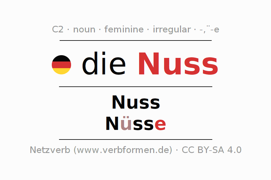 - Plural: die Nüsse, der Nüsse, den Nüssen, die Nüsse