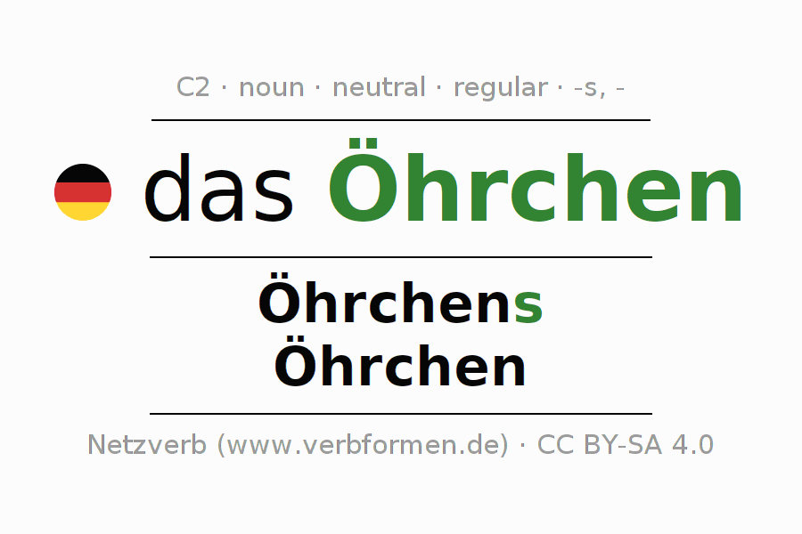 The declension of Öhrchen as a table with all forms in singular (singular) and plural (plural) and in all four cases nominative (1st case), genitive (2nd case), dative (3rd case) and accusative (4th case). Especially for German learners the correct declension of the word Öhrchen is crucial.