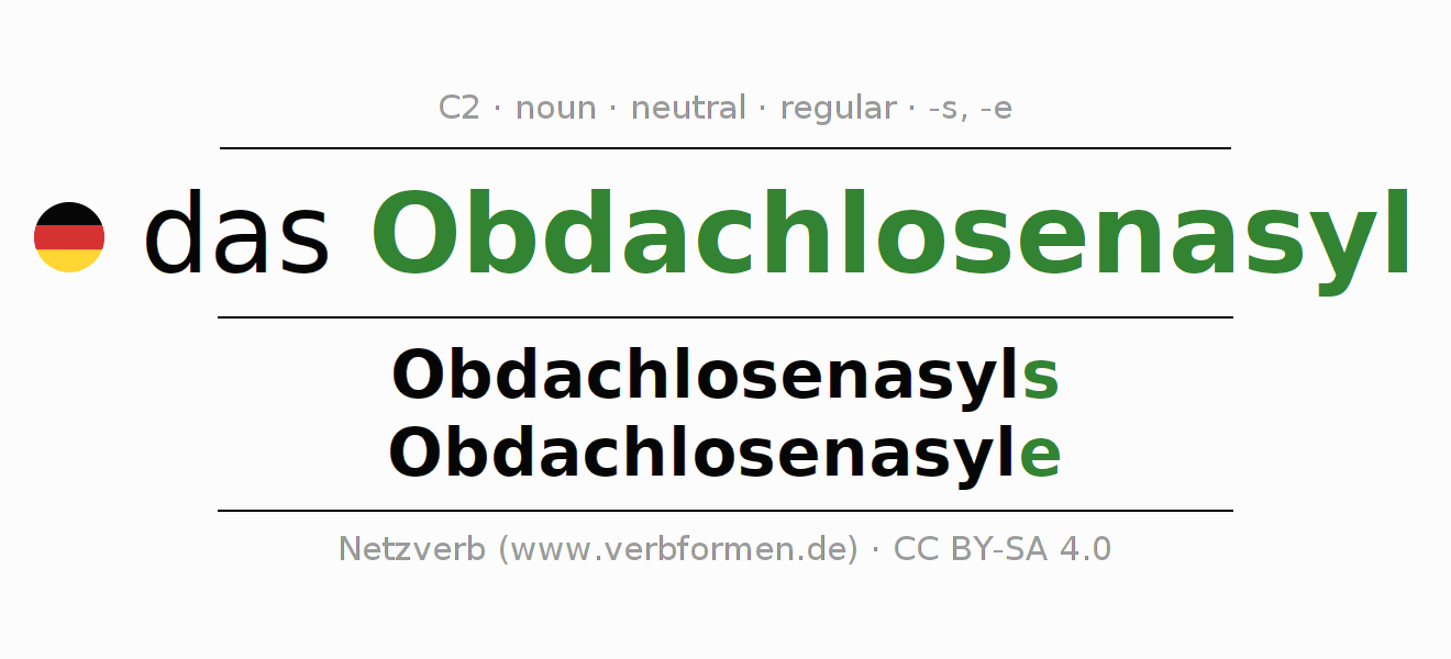 The declension of Obdachlosenasyl as a table with all forms in singular (singular) and plural (plural) and in all four cases nominative (1st case), genitive (2nd case), dative (3rd case) and accusative (4th case). Especially for German learners the correct declension of the word Obdachlosenasyl is crucial.