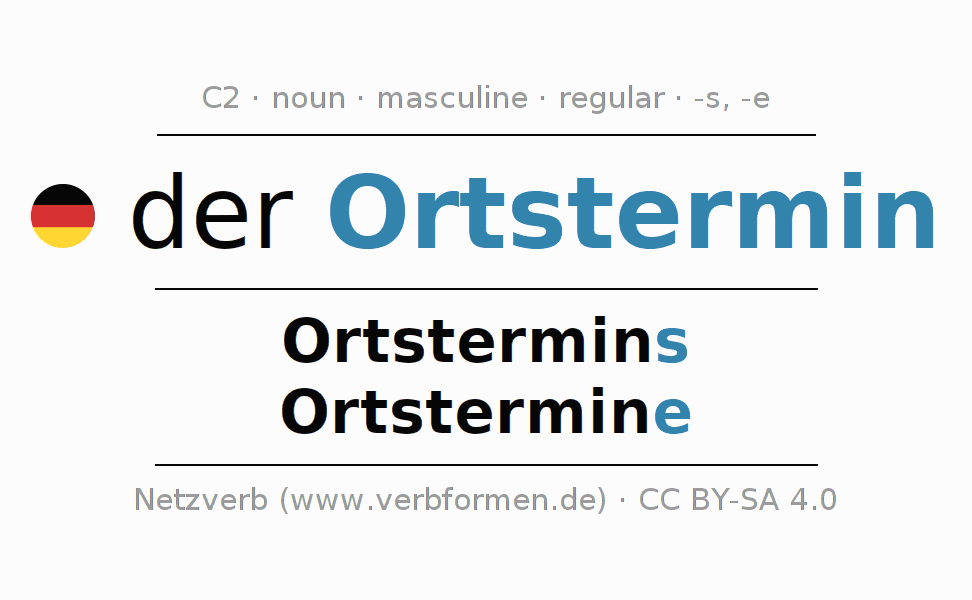 - Singular: der Ortstermin, des Ortstermins, dem Ortstermin, den Ortstermin