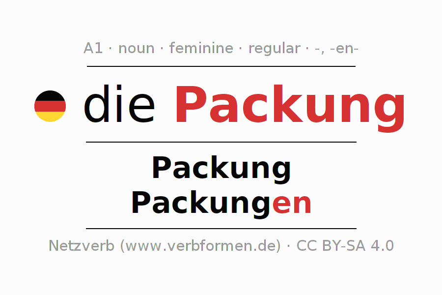 - Plural: die Packungen, der Packungen, den Packungen, die Packungen