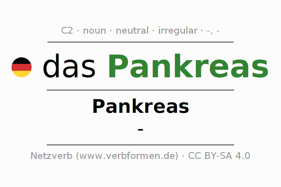 The declension of Pankreas as a table with all forms in singular (singular) and plural (plural) and in all four cases nominative (1st case), genitive (2nd case), dative (3rd case) and accusative (4th case). Especially for German learners the correct declension of the word Pankreas is crucial.