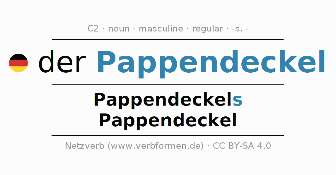 The declension of Pappendeckel as a table with all forms in singular (singular) and plural (plural) and in all four cases nominative (1st case), genitive (2nd case), dative (3rd case) and accusative (4th case). Especially for German learners the correct declension of the word Pappendeckel is crucial.