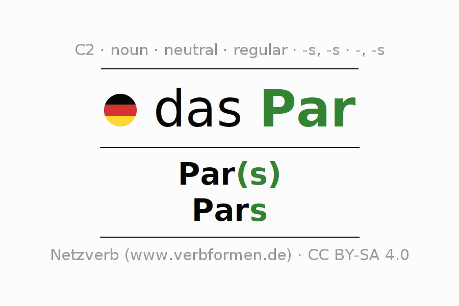 The declension of Par as a table with all forms in singular (singular) and plural (plural) and in all four cases nominative (1st case), genitive (2nd case), dative (3rd case) and accusative (4th case). Especially for German learners the correct declension of the word Par is crucial.