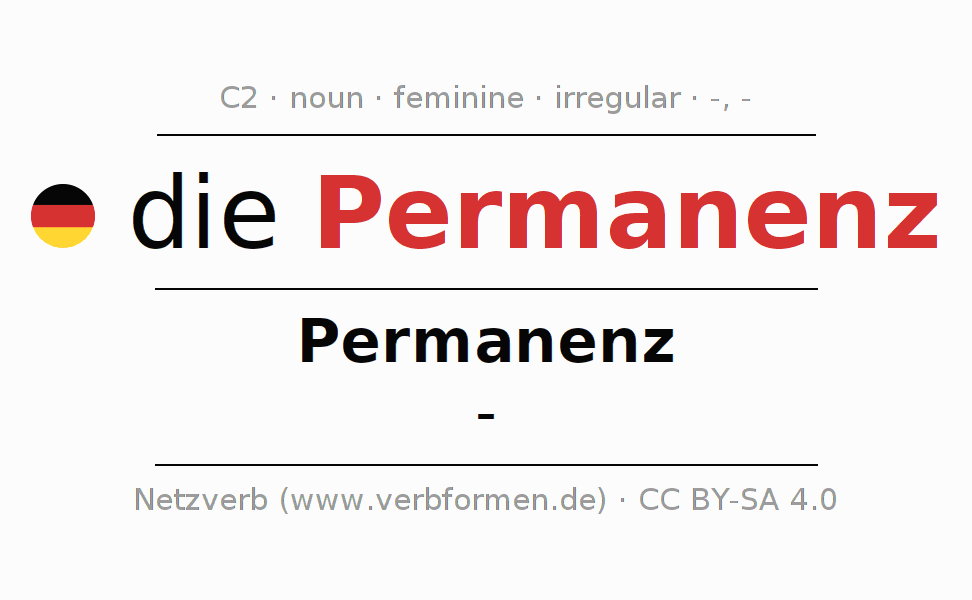 The declension of Permanenz as a table with all forms in singular (singular) and plural (plural) and in all four cases nominative (1st case), genitive (2nd case), dative (3rd case) and accusative (4th case). Especially for German learners the correct declension of the word Permanenz is crucial.