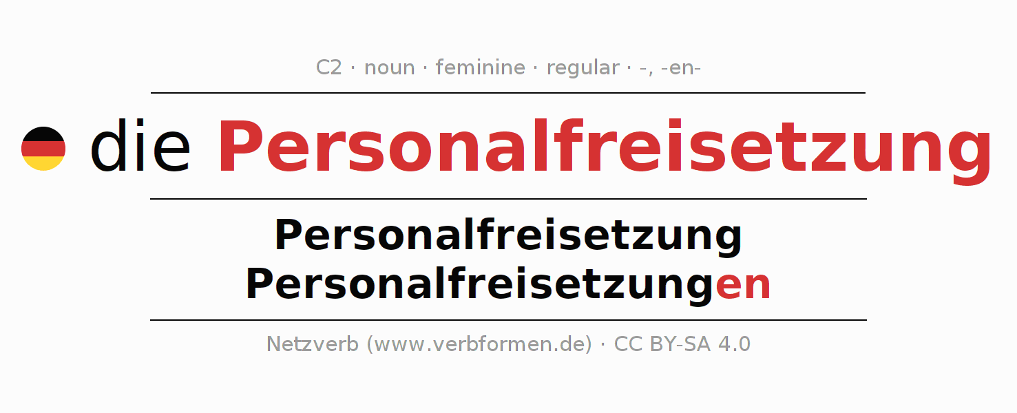 The declension of Personalfreisetzung as a table with all forms in singular (singular) and plural (plural) and in all four cases nominative (1st case), genitive (2nd case), dative (3rd case) and accusative (4th case). Especially for German learners the correct declension of the word Personalfreisetzung is crucial.