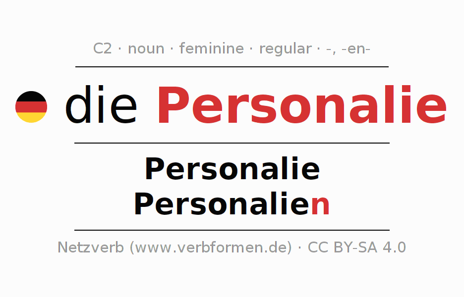 - Plural: die Personalien, der Personalien, den Personalien, die Personalien