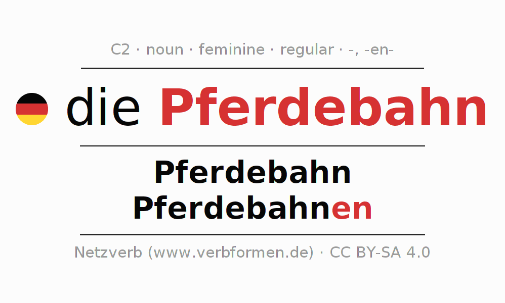 The declension of Pferdebahn as a table with all forms in singular (singular) and plural (plural) and in all four cases nominative (1st case), genitive (2nd case), dative (3rd case) and accusative (4th case). Especially for German learners the correct declension of the word Pferdebahn is crucial.