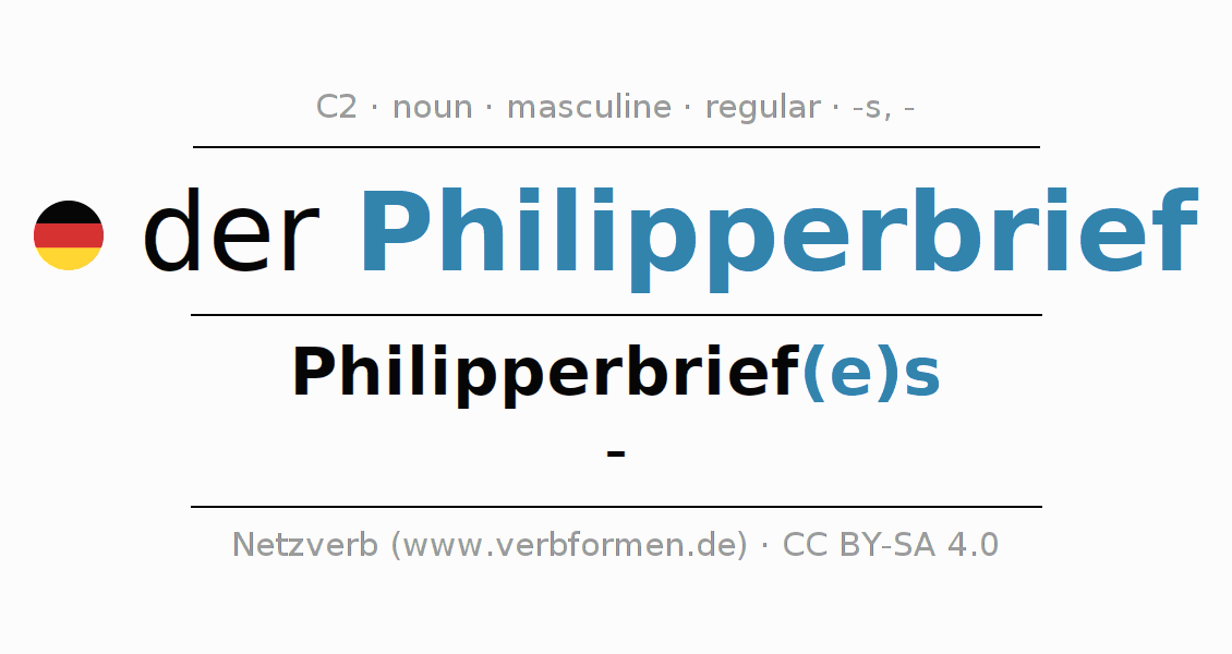 The declension of Philipperbrief as a table with all forms in singular (singular) and plural (plural) and in all four cases nominative (1st case), genitive (2nd case), dative (3rd case) and accusative (4th case). Especially for German learners the correct declension of the word Philipperbrief is crucial.