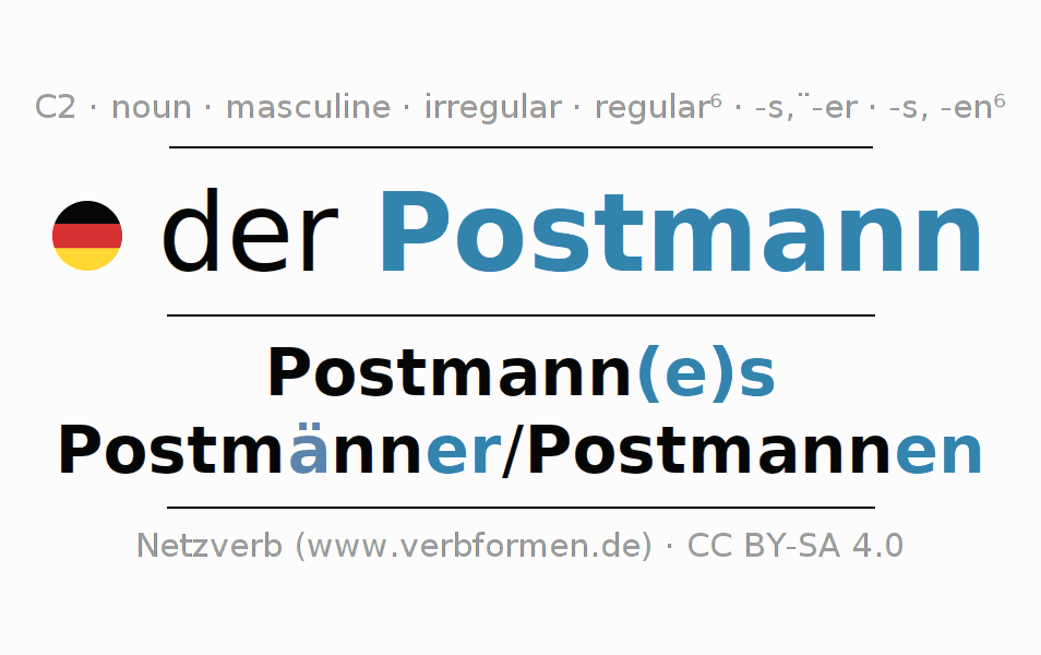 - Singular: der Postmann, des Postmann(e)s, dem Postmann(e), den Postmann