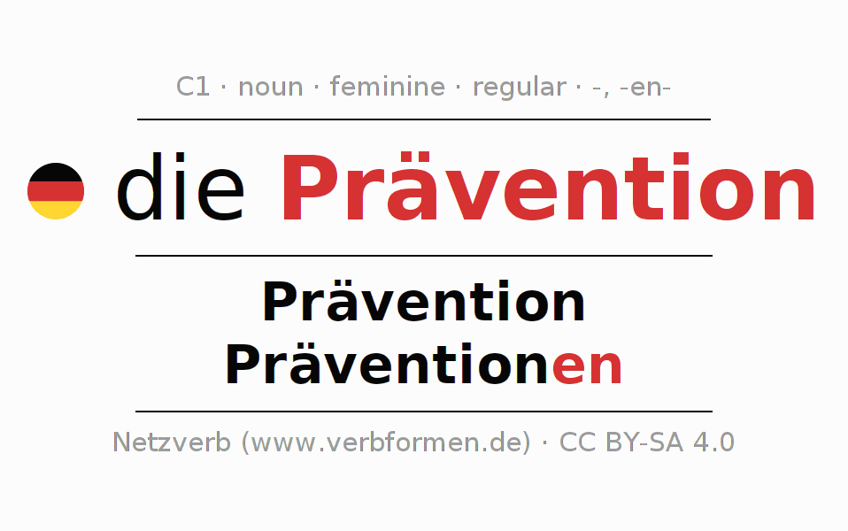 - Singular: die Prävention, der Prävention, der Prävention, die Prävention