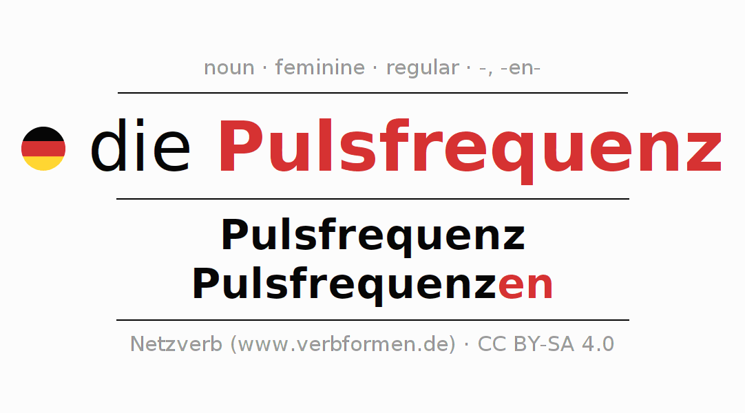 The declension of Pulsfrequenz as a table with all forms in singular (singular) and plural (plural) and in all four cases nominative (1st case), genitive (2nd case), dative (3rd case) and accusative (4th case). Especially for German learners the correct declension of the word Pulsfrequenz is crucial.