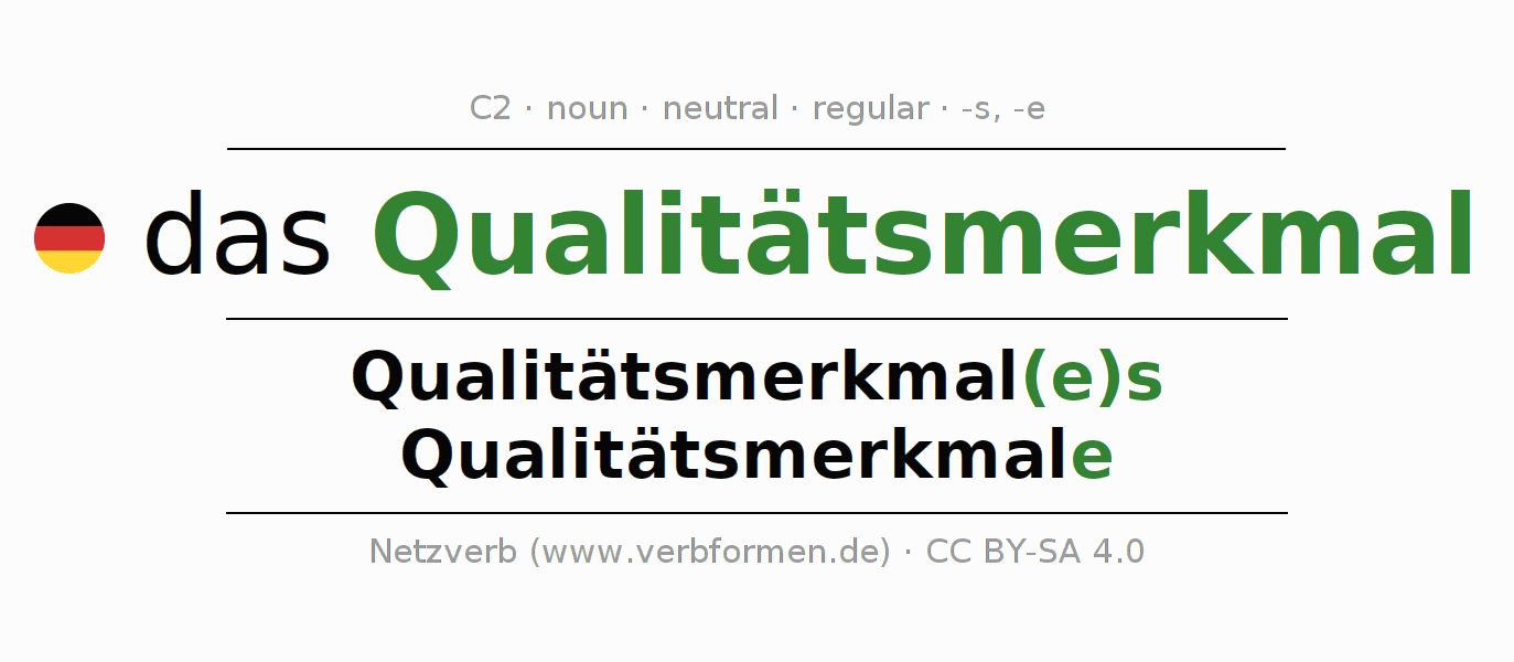 - Plural: die Qualitätsmerkmale, der Qualitätsmerkmale, den Qualitätsmerkmalen, die Qualitätsmerkmale