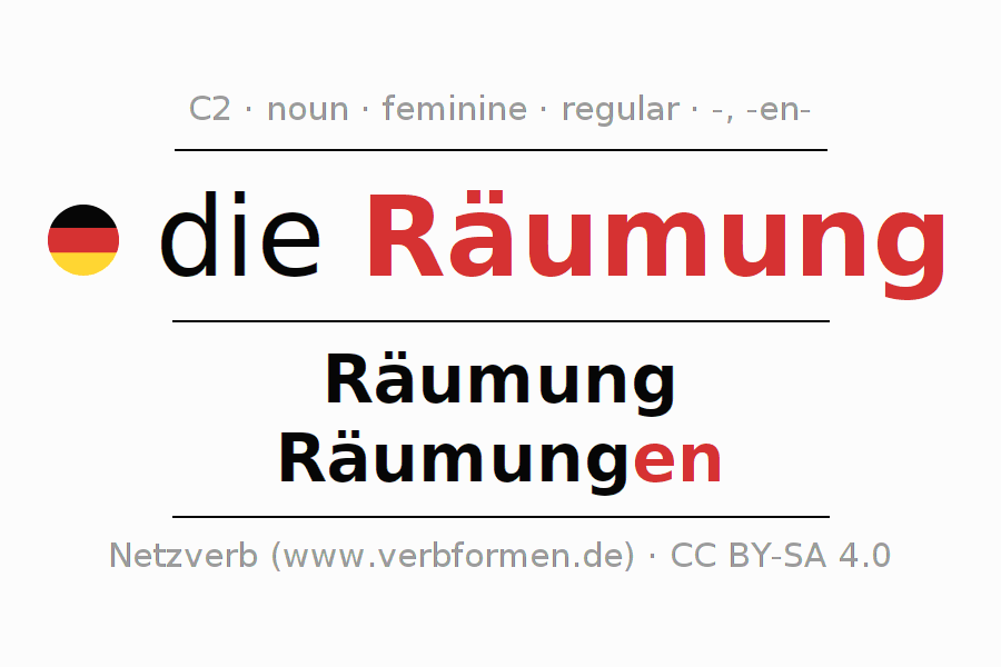 - Plural: die Räumungen, der Räumungen, den Räumungen, die Räumungen