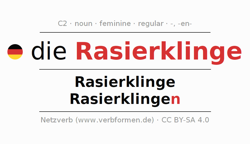 - Plural: die Rasierklingen, der Rasierklingen, den Rasierklingen, die Rasierklingen