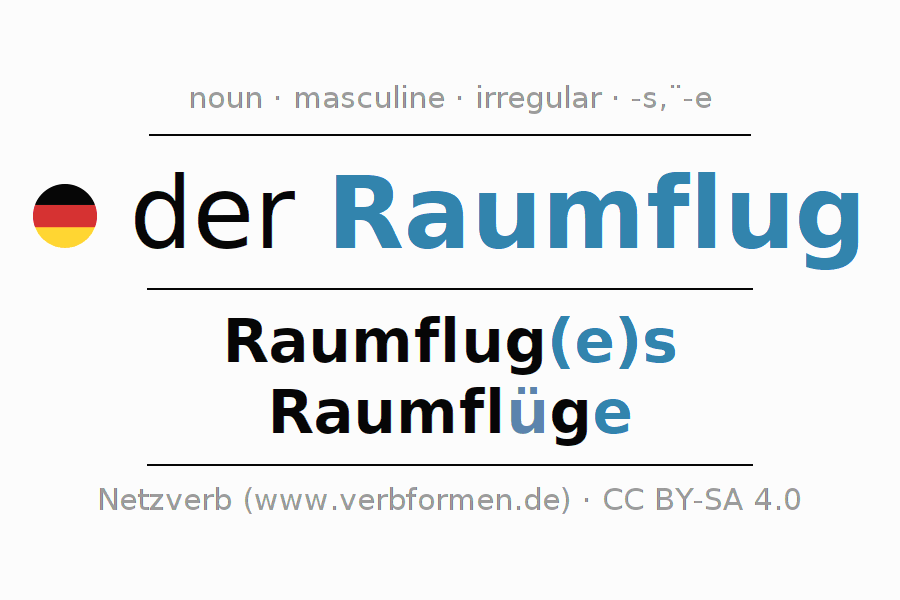 - Plural: die Raumflüge, der Raumflüge, den Raumflügen, die Raumflüge