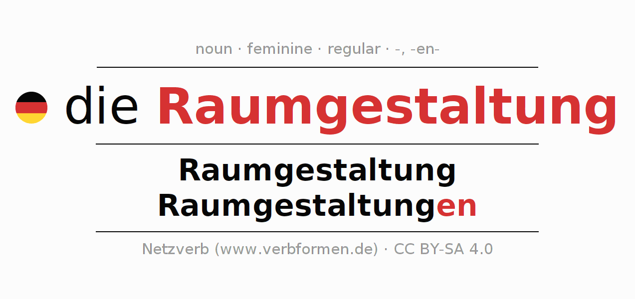 - Singular: die Raumgestaltung, der Raumgestaltung, der Raumgestaltung, die Raumgestaltung