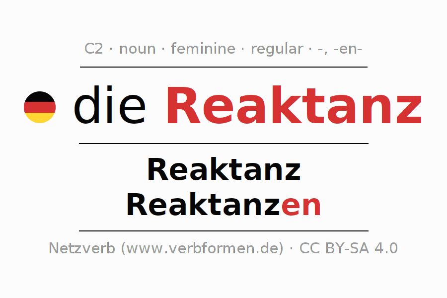 - Singular: die Reaktanz, der Reaktanz, der Reaktanz, die Reaktanz