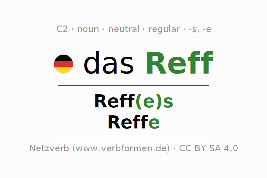 - Singular: das Reff, des Reff(e)s, dem Reff(e), das Reff