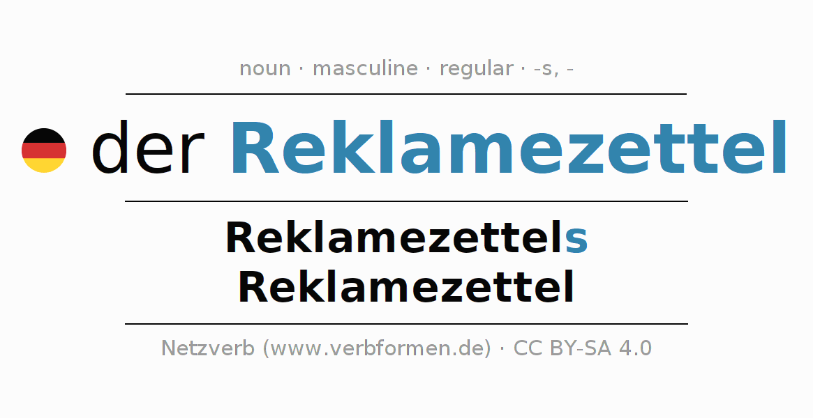 - Singular: der Reklamezettel, des Reklamezettels, dem Reklamezettel, den Reklamezettel
