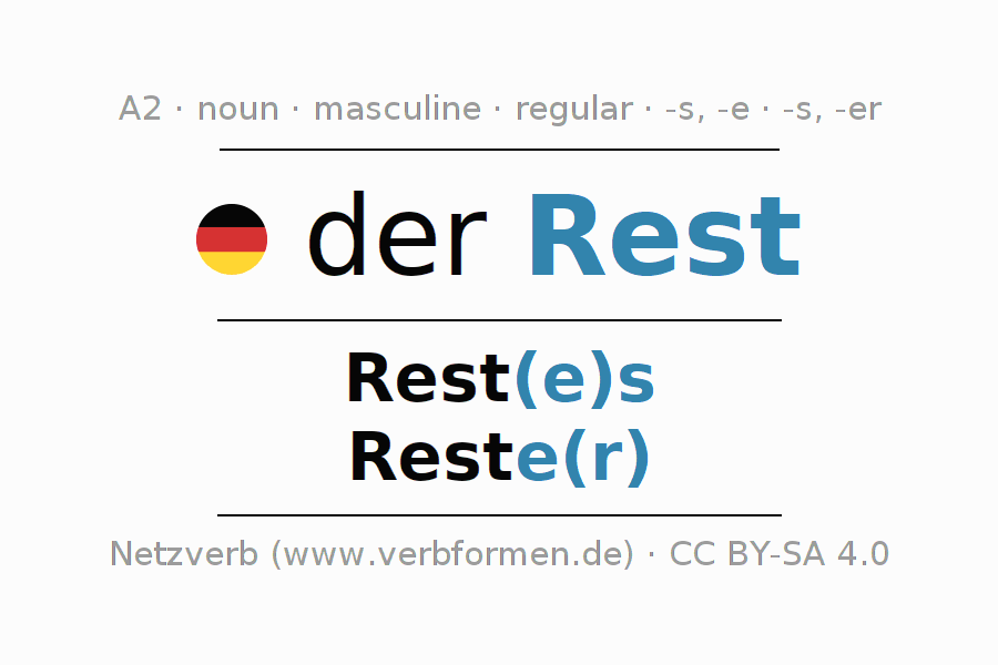 - Singular: der Rest, des Rest(e)s, dem Rest(e), den Rest