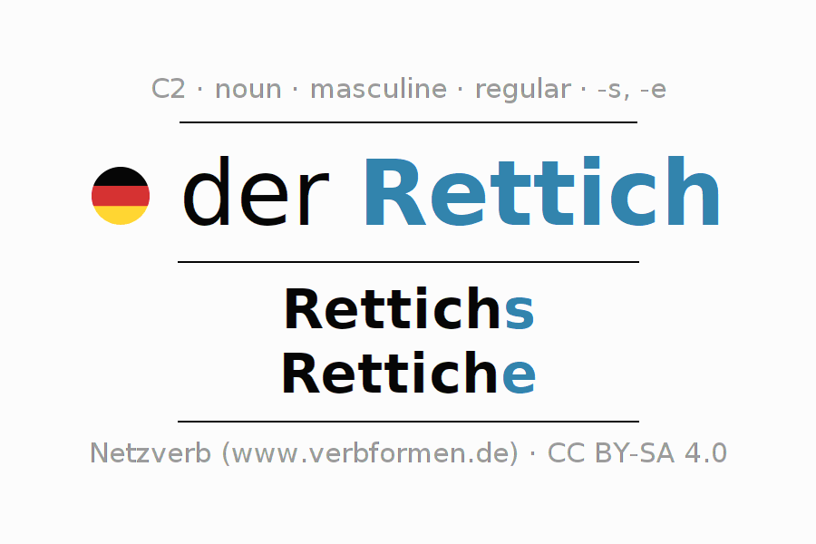 - Singular: der Rettich, des Rettichs, dem Rettich, den Rettich