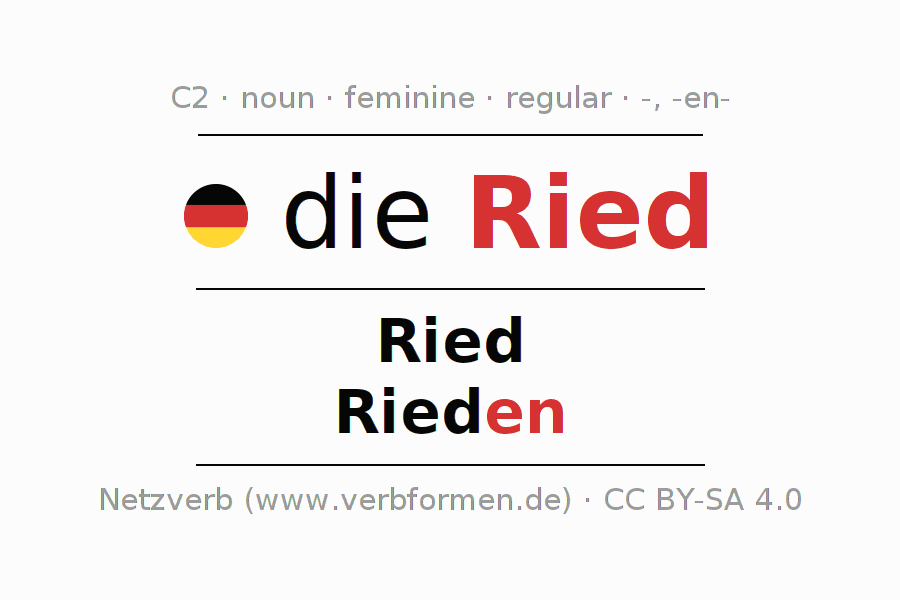 The declension of die Ried as a table with all forms in singular (singular) and plural (plural) and in all four cases nominative (1st case), genitive (2nd case), dative (3rd case) and accusative (4th case). Especially for German learners the correct declension of the word die Ried is crucial.