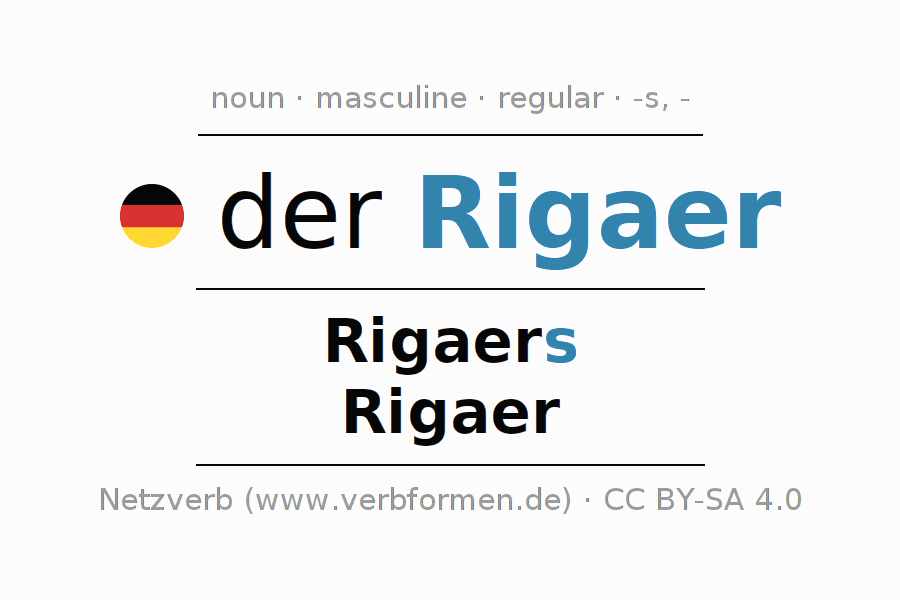 The declension of Rigaer as a table with all forms in singular (singular) and plural (plural) and in all four cases nominative (1st case), genitive (2nd case), dative (3rd case) and accusative (4th case). Especially for German learners the correct declension of the word Rigaer is crucial.