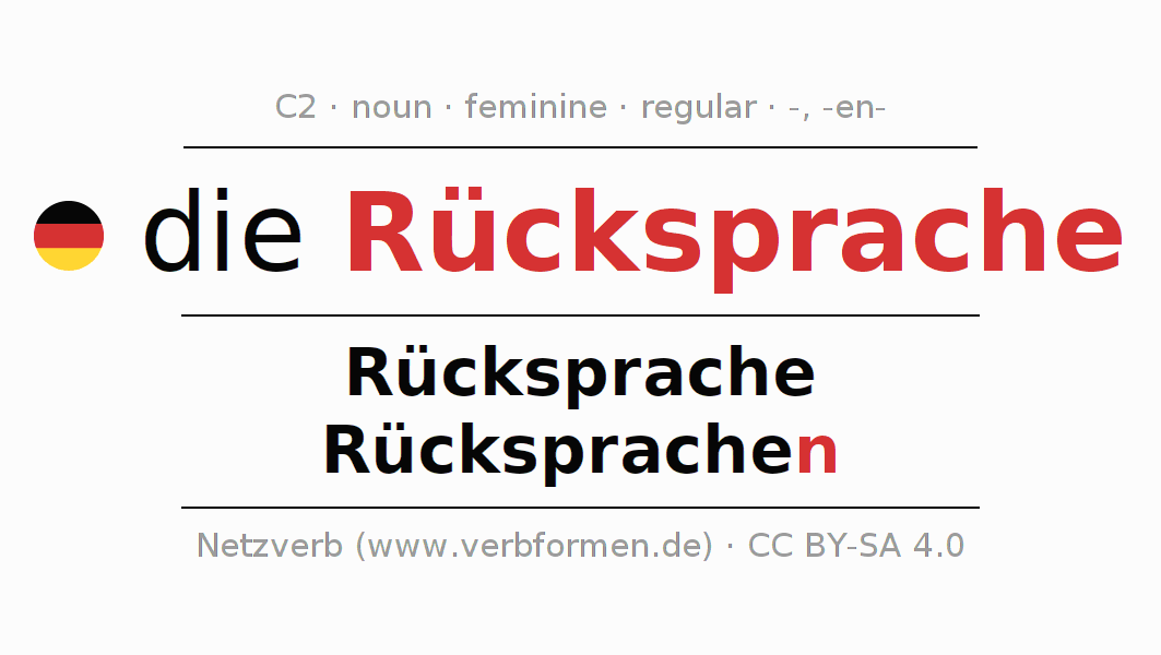 The declension of Rücksprache as a table with all forms in singular (singular) and plural (plural) and in all four cases nominative (1st case), genitive (2nd case), dative (3rd case) and accusative (4th case). Especially for German learners the correct declension of the word Rücksprache is crucial.