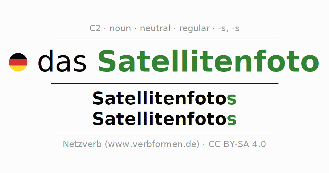 The declension of Satellitenfoto as a table with all forms in singular (singular) and plural (plural) and in all four cases nominative (1st case), genitive (2nd case), dative (3rd case) and accusative (4th case). Especially for German learners the correct declension of the word Satellitenfoto is crucial.