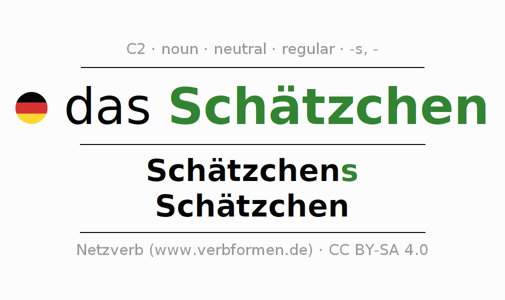 The declension of Schätzchen as a table with all forms in singular (singular) and plural (plural) and in all four cases nominative (1st case), genitive (2nd case), dative (3rd case) and accusative (4th case). Especially for German learners the correct declension of the word Schätzchen is crucial.