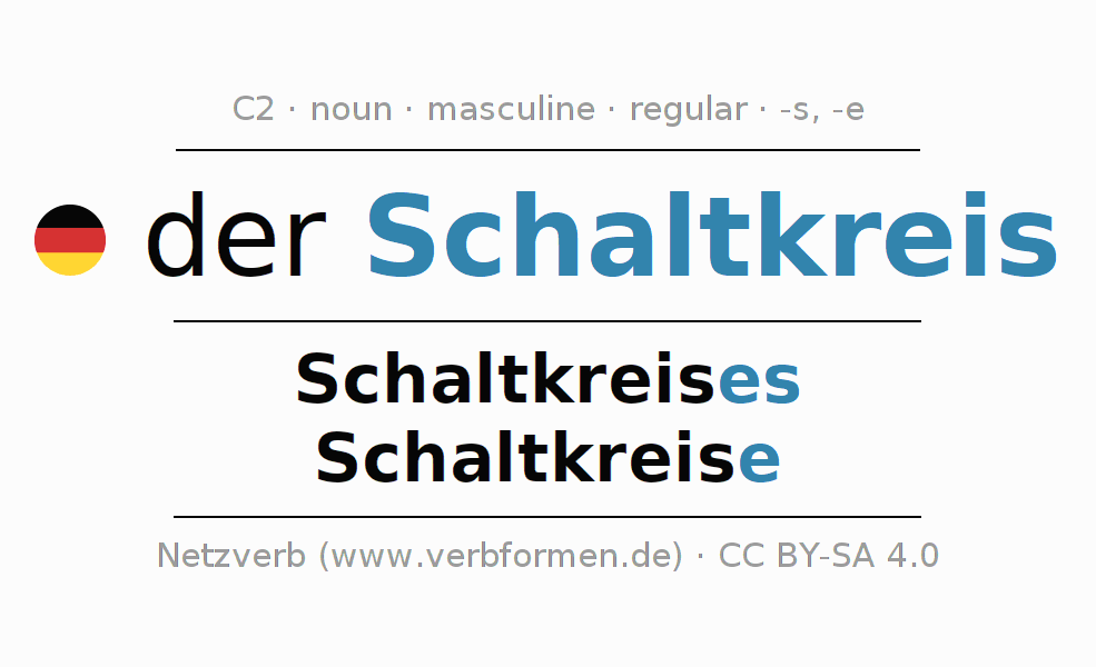 The declension of Schaltkreis as a table with all forms in singular (singular) and plural (plural) and in all four cases nominative (1st case), genitive (2nd case), dative (3rd case) and accusative (4th case). Especially for German learners the correct declension of the word Schaltkreis is crucial.