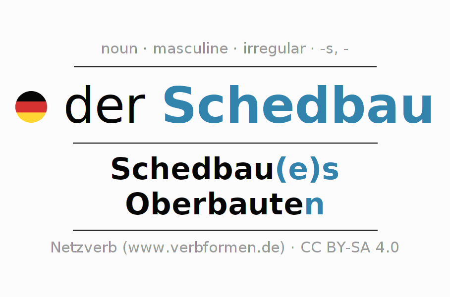 The declension of Schedbau as a table with all forms in singular (singular) and plural (plural) and in all four cases nominative (1st case), genitive (2nd case), dative (3rd case) and accusative (4th case). Especially for German learners the correct declension of the word Schedbau is crucial.