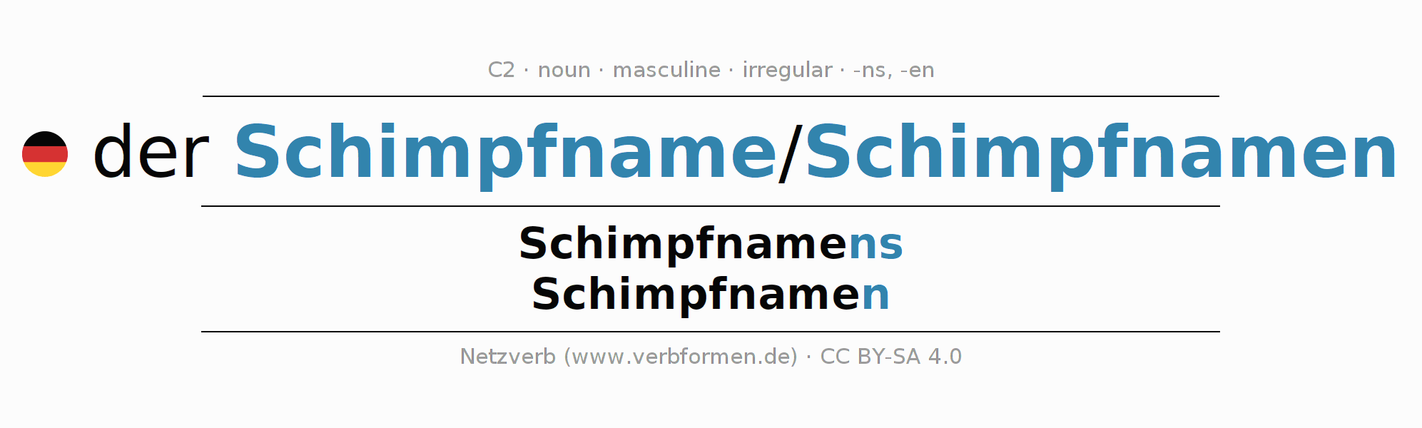 The declension of Schimpfname as a table with all forms in singular (singular) and plural (plural) and in all four cases nominative (1st case), genitive (2nd case), dative (3rd case) and accusative (4th case). Especially for German learners the correct declension of the word Schimpfname is crucial.