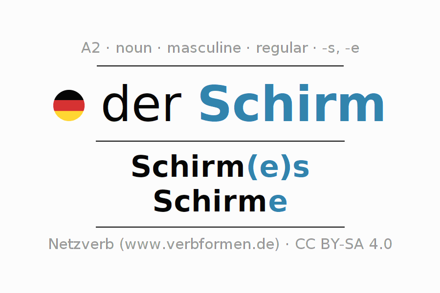 - Plural: die Schirme, der Schirme, den Schirmen, die Schirme